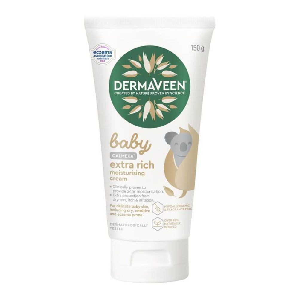 DermaVeen Baby Calmexa Extra Rich Moisturising Cream is an intensely nourishing, non-greasy cream designed for very dry and sensitive baby skin. Clinically proven to deliver 24-hour moisturisation and improve hydration in just 15 minutes, it forms a protective moisture layer to restore and maintain the skin’s natural barrier. Made with 100% natural colloidal oatmeal, ceramides, and Kakadu plum, this hypoallergenic, fragrance-free cream provides long-lasting softness and comfort. Vegan friendly and proudly made in Australia.