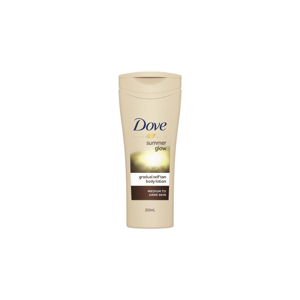Dove Summer Glow Gradual Self-Tan Body Lotion Medium to Dark gradually builds a natural-looking tan while nourishing skin with DeepCare Complex for a soft, radiant glow all year round.