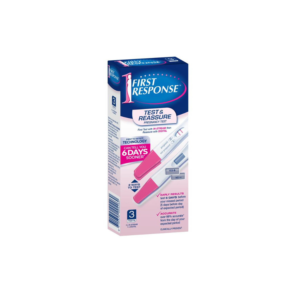 First Response Early Result & Digital Pregnancy Test Pack includes 2 early in-stream tests (detect up to 6 days before a missed period) and 1 digital test with clear Yes+/No– results for added reassurance.