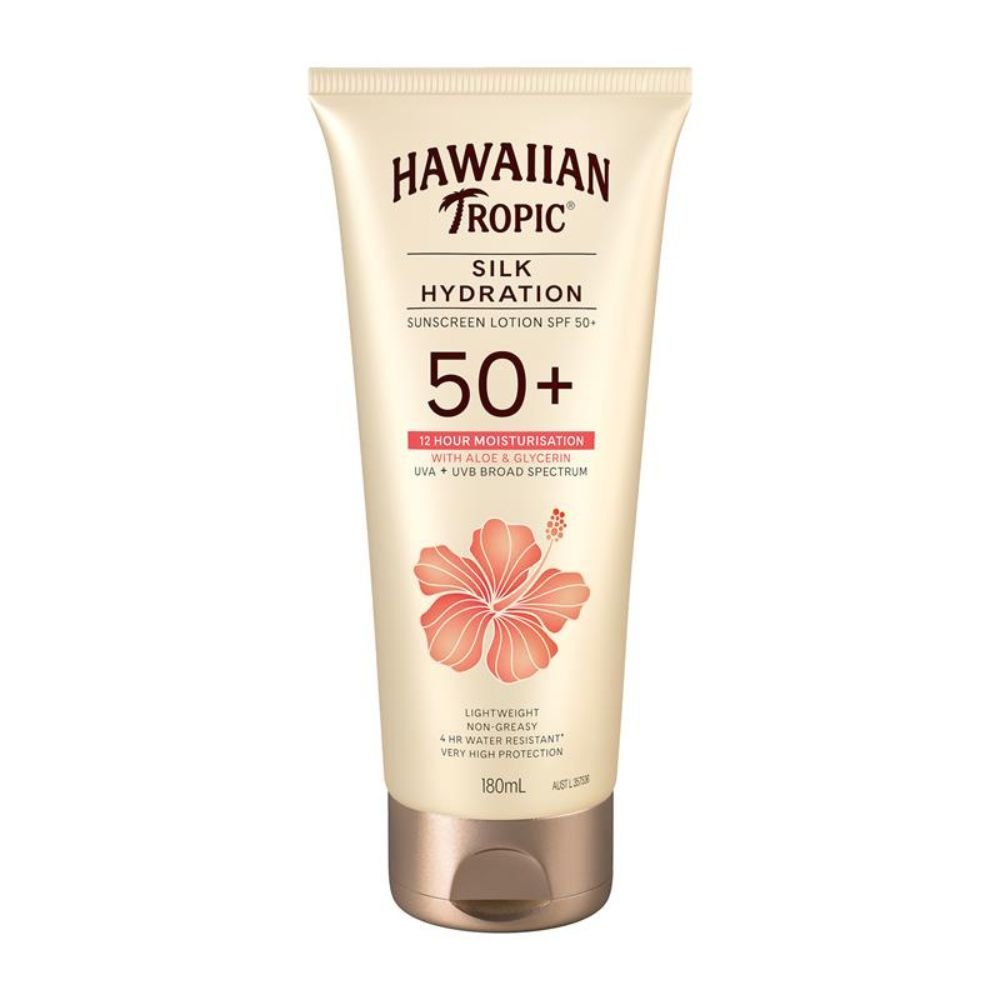 Hawaiian Tropic® Silk Hydration Sunscreen Lotion SPF 50+ delivers very high UVA/UVB protection with a lightweight, fast-absorbing formula. Providing up to 12 hours of moisturisation and a silky, non-greasy feel, it keeps skin protected, hydrated and lightly scented with the iconic tropical fragrance.