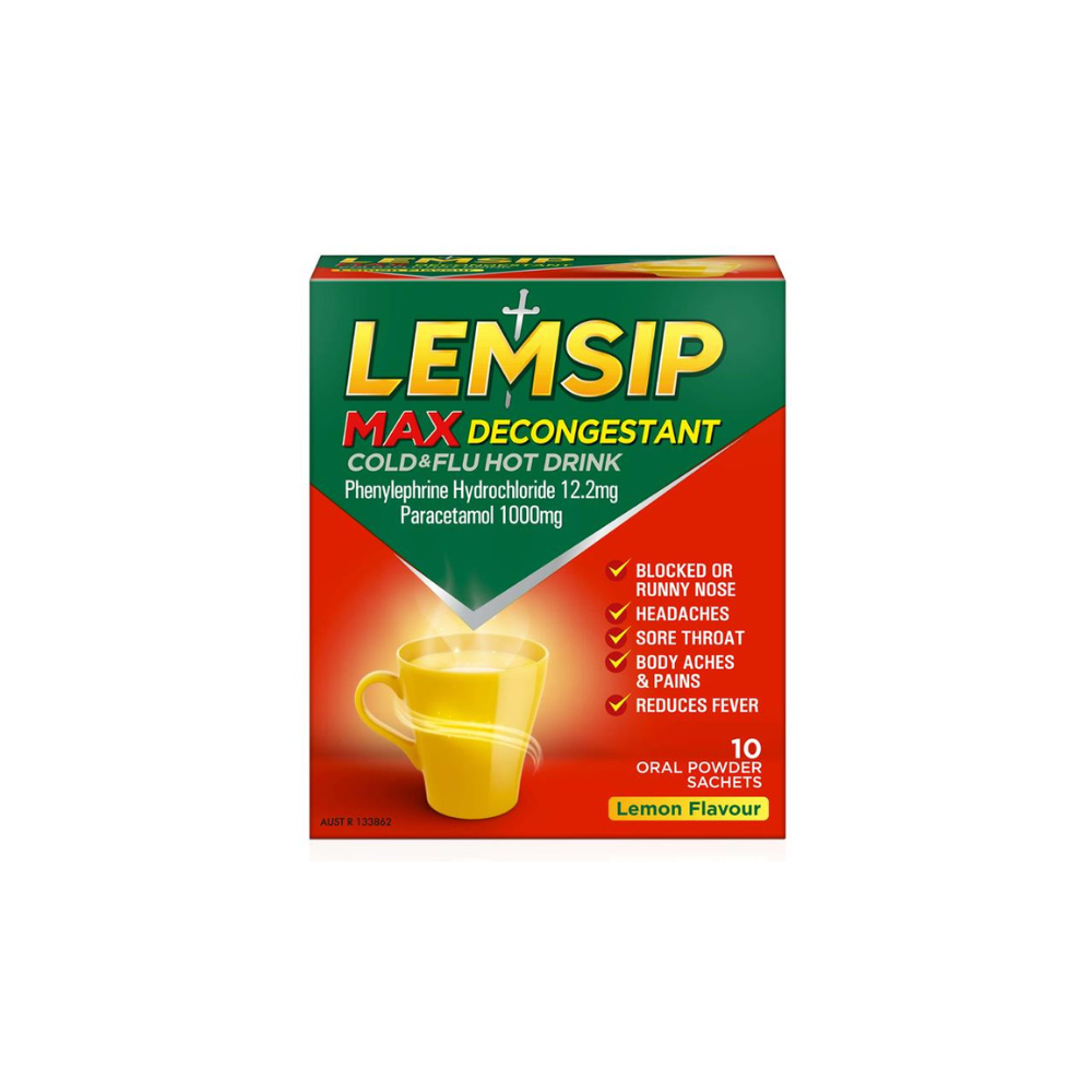 Lemsip Max Decongestant Cold & Flu Hot Drink Lemon provides temporary relief from cold and flu symptoms including blocked or runny nose, headache, sore throat, body aches, and fever (10 sachets).
