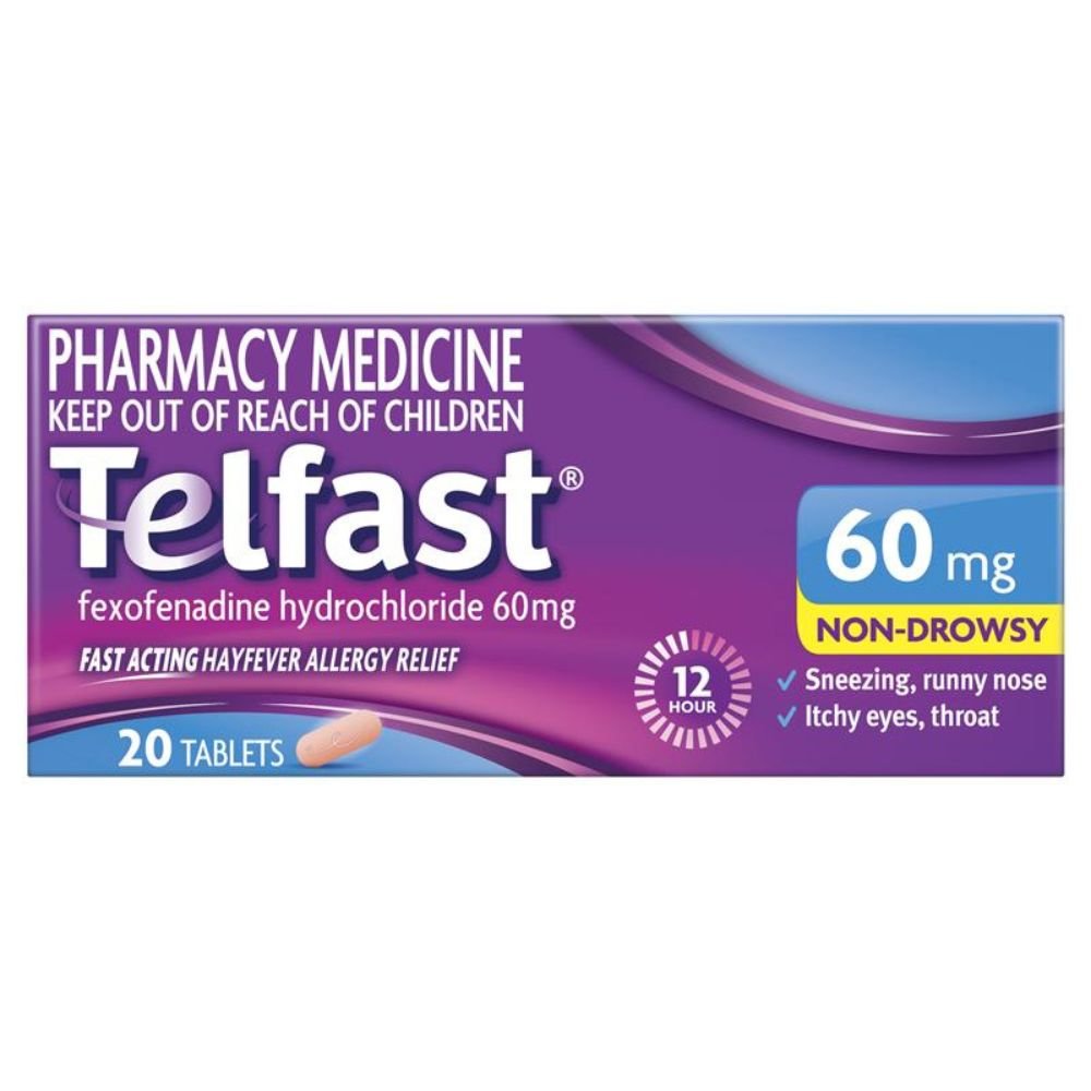 Telfast 60mg Tablets provide effective, non-drowsy relief from hayfever and perennial allergies. Containing fexofenadine hydrochloride, an antihistamine that helps block the effects of histamine, it reduces allergy symptoms without causing drowsiness. Suitable for adults and children from 12 years. Pack contains 20 tablets.