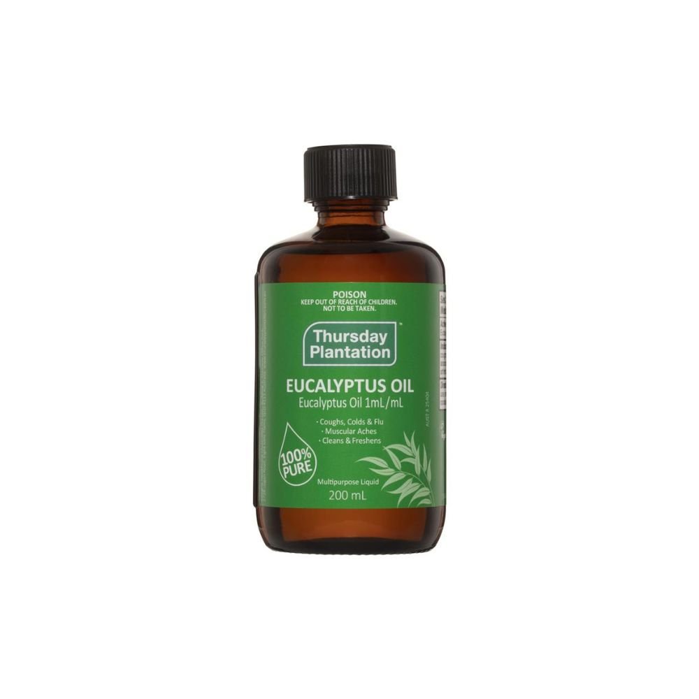 Thursday Plantation 100% Pure Eucalyptus Oil (200mL) is a pharmaceutical-grade, multipurpose oil suitable for both personal and household use. It helps clear airways and temporarily relieves cold, flu, and muscular aches when used in inhalation or diluted for massage. It also works as a natural cleaner, killing 99.9% of household germs and helping remove stains, grease, and tar. Made with 100% pure eucalyptus oil, it is vegan and not tested on animals.