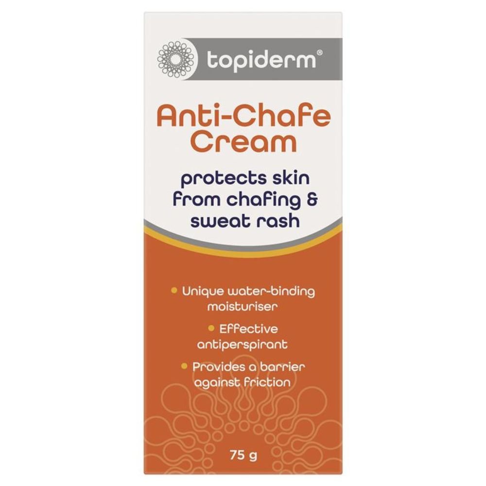 Topiderm Anti-Chafe Cream (75g) helps protect skin from chafing and sweat rash. Its unique water-binding moisturising system attracts and locks in moisture, while the effective antiperspirant action keeps skin dry. The cream also creates a protective barrier against friction, helping to prevent redness, soreness, and irritation caused by sweating and rubbing. Ideal for everyday comfort and protection.